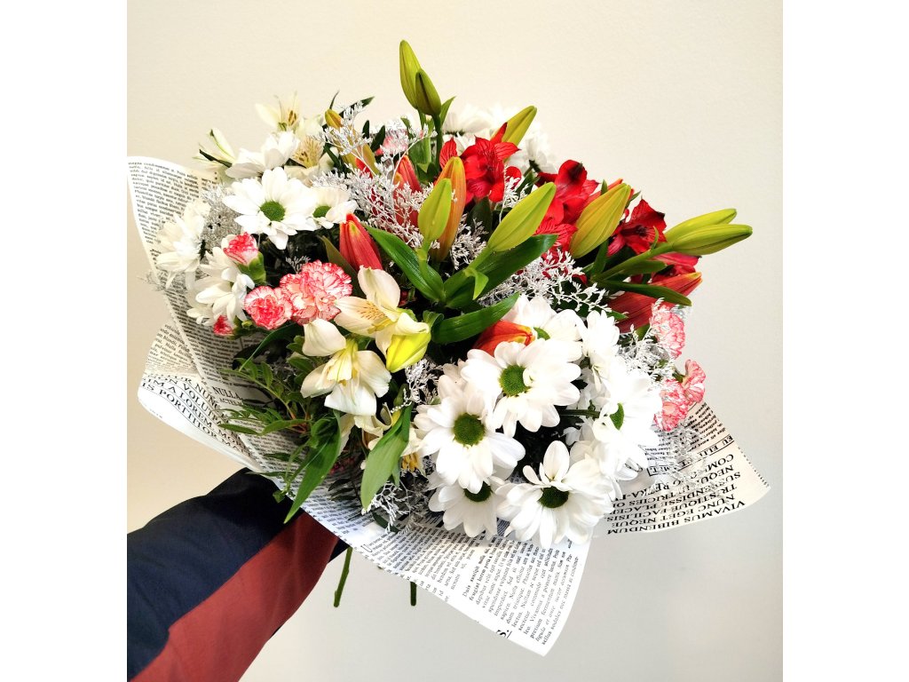 Kytice na obrázku obsahuje následující květiny a zeleň: